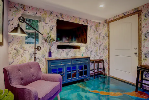 Don't miss this stunning retro space-themed home, Galactic Oasis 1966! It's a blend of a 1966 household with modern luxuries. Explore the lives of fictional characters like Colonel Lance T. Trident and his family preparing for the 1966 moon landing. Guests can discover their story through Space Age artifacts scattered around the house. Despite its eccentricity, the decor, including a huge custom round circle bed, is uniquely beautiful. Plus, it's conveniently close to the airport and U.S. Space Force bases.